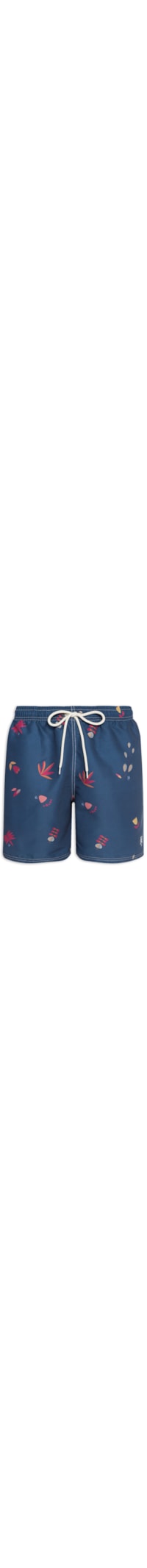 O short azul marinho é confeccionado em tactel. A peça possui cintura média, cós elástico com cordão embutido para ajuste, bolso posterior com aplicação de ilhós e gorgurão com fechamento por velcro, tag da marca aplicada na parte posterior, bolsos frontais, logo da marca bordado na parte frontal, estampa figurativa em cores contrastantes, forro em tela, caimento reto e acabamento pespontado.