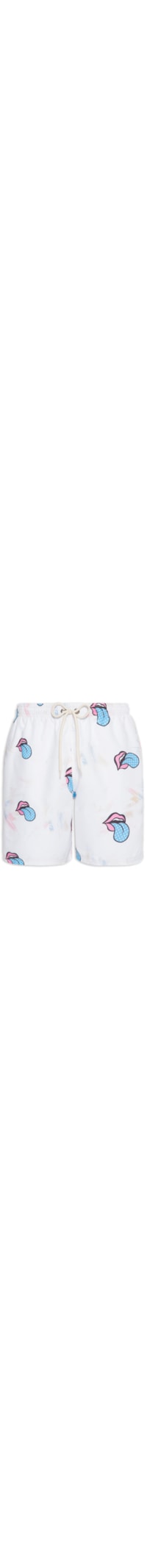 O short branco é confeccionado em tactel. A peça possui cintura média, cós elástico com cordões embutidos para ajuste, logo da marca bordado na parte frontal, estampa figurativa em cores contrastantes, bolsos frontais modelo faca, bolso posterior com fechamento de velcro e detalhe de aviamento, ilhós aplicado na parte posterior, tag da marca aplicada na parte posterior, shape solto, caimento reto, comprimento curto e acabamento pespontado.