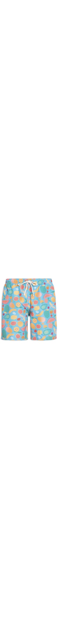 O short azul é confeccionado em tactel. A peça possui cintura média, cós elástico com cordão embutido para ajuste, bolso posterior com aplicação de ilhós e gorgurão com fechamento por velcro, tag da marca aplicada na parte posterior, bolsos frontais, logo da marca bordado na parte frontal, estampa figurativa em cores contrastantes, forro em tela, caimento reto e acabamento pespontado.