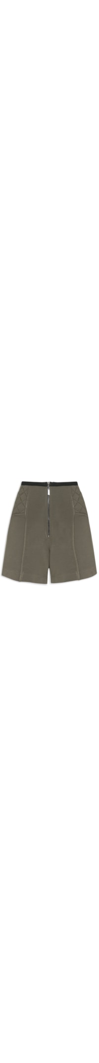 O short verde é confeccionado em tecido leve. A peça possui cintura alta, recortes frontais, recorte posterior com superfície matelassê, fendas laterais, comprimento curto, acabamento pespontado e fechamento frontal por zíper.