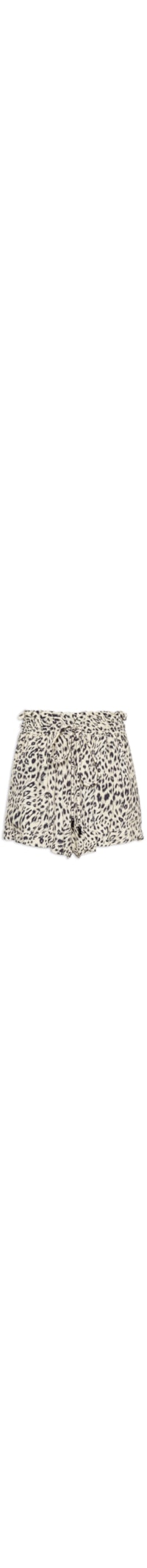O short preto é confeccionado em tecido leve sem elasticidade. A peça solta ao corpo possui cintura alta, cós com elástico embutido e babado superior, faixa aplicada para amarração frontal, bolsos frontais modelo faca, estampa animal print em cor contrastante, comprimento curto e barra com acabamento simples.