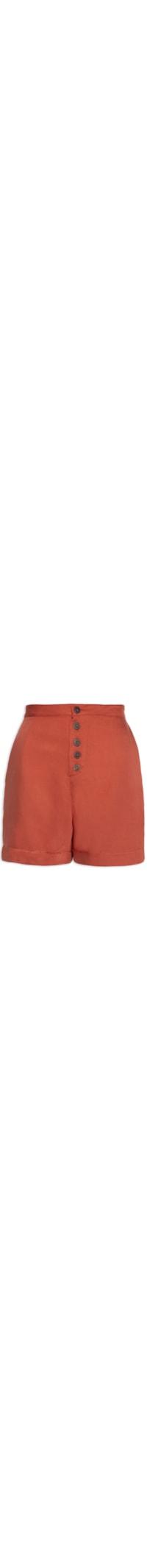 O short laranja é confeccionado em tecido leve com toque de linho. A peça possui cintura alta, bolsos frontais, vincos posteriores, shape solto, caimento reto, acabamento pespontado e fechamento frontal por botões.