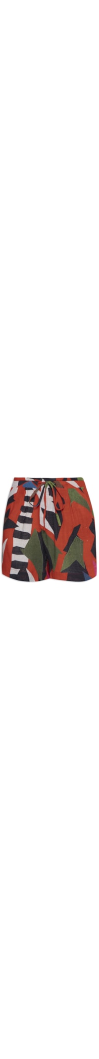 O short vermelho é confeccionado em tecido leve sem elasticidade. A peça solta ao corpo possui cintura alta, cós com cordão alongado para amarração, pregas nas partes posterior e frontal na altura do cós, bolos frontais modelo faca, estampa abstrata em cores contrastantes, comprimento curto e fechamento frontal por zíper.