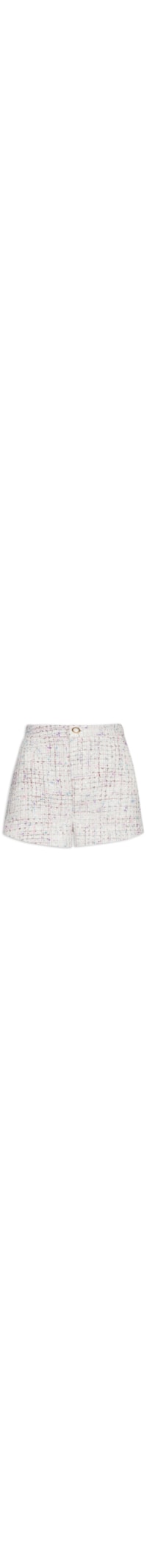 o Short Off White é Confeccionado Em Tweed Sem Elasticidade. A Peça Solta Ao Corpo Possui Cintura Alta, Cós Com Tag Metálica Da Marca Aplicada Na Parte Posterior, Bolsos Frontais De Modelo Faca, Pences Posteriores, Trama Com Fios Em Tons Contrastantes, Forro, Comprimento Curto E Fechamento Frontal Em Zíper E Botão.