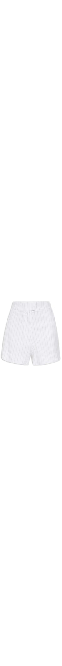 O short branco é confeccionado em alfaiataria. A peça possui cintura alta, cós com elástico embutido na parte posterior, bolsos frontais modelo faca, padronagem risca de giz em cores contrastantes, comprimento curto, shape solto, caimento reto, acabamento pespontado e fechamento frontal por zíper, botão e colchete.