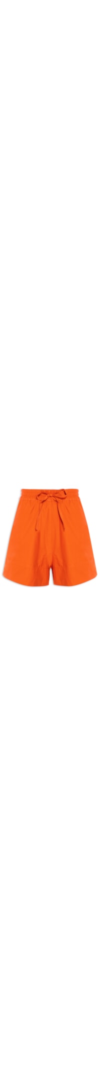 O short laranja é confeccionado em tricoline. A peça possui cintura alta, cós com cordão e elástico embutido para ajuste, bolsos frontais embutidos, pences e bolsos posteriores, comprimento curto, shape solto, caimento reto e acabamento pespontado.