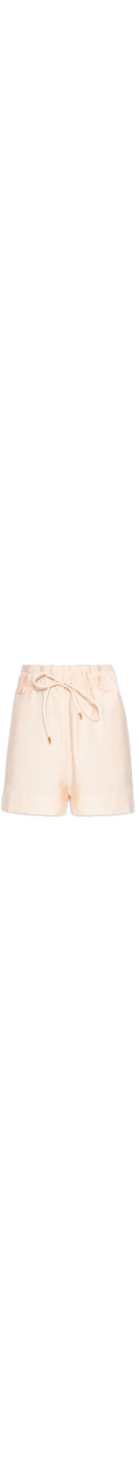 O short bege é confeccionado em tecido leve sem elasticidade. A peça solta ao corpo possui o modelo clochard, cintura alta, cós com passantes aplicados na parte frontal com detalhe de botões forrados e elástico com tira alongada embutidos para amarração frontal, bolso faca nas laterais e comprimento curto.