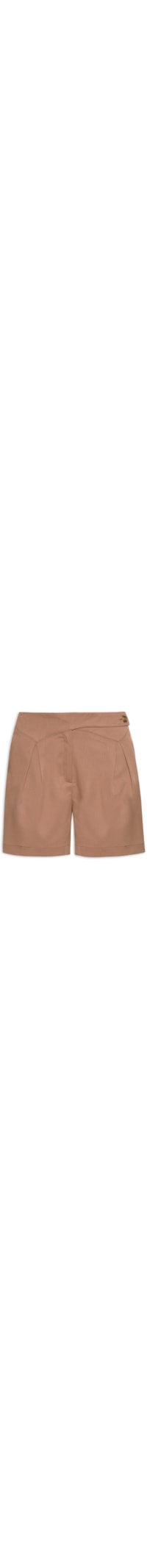 O short marrom é confeccionado em tecido leve sem elasticidade. A peça possui cós com pala assimétrica sobreposta, pregas frontais, bolsos frontais embutidos, caimento reto, comprimento curto, barra com acabamento simples e fechamento frontal por zíper e botão.