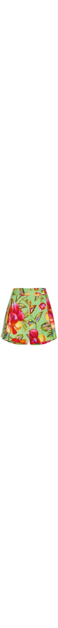 O short verde é confeccionado em linho misto sem elasticidade. A peça solta ao corpo possui cintura alta, cós com passantes, pences posteriores e pregas frontais na altura do cós, bolsos frontais modelo faca, estampa floral em cores contrastantes e fechamento frontal por colchetes e zíper.