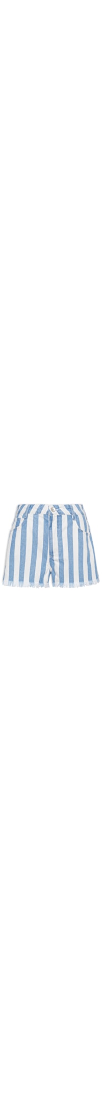 O short azul é confeccionado em sarja com lavagem em jeans sem elasticidade. A peça solta ao corpo possui cintura alta, cós com passantes e tag da marca bordada na parte posterior, recorte posterior, logo da marca aplicado em metal na parte posterior, five pockets* padronagem listrada na cor off white, barras desfiadas e fechamento frontal por botão e zíper.