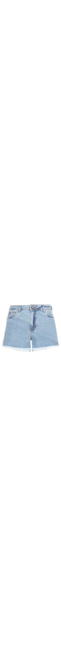 O short azul é confeccionado em sarja com lavagem jeans sem elasticidade. A peça solta ao corpo, possui cintura alta, cós com passantes aplicados, five pockets* com rebites aplicados, tag da marca aplicada no bolso frontal, tag da marca com recorte vazado e detalhe metálico aplicado na parte posterior do cós, barra desfiada e fechamento frontal por zíper e botão.