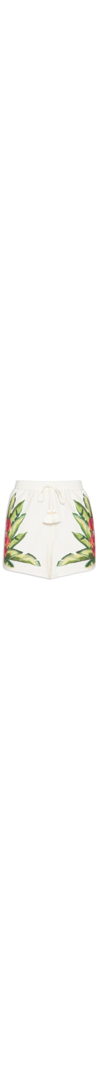O short off white é confeccionado em tecido leve com toque de linho sem elasticidade. A peça possui cintura alta, cós com elástico e cordão embutidos para ajuste com ponteiras em tassel, bolsos frontais de modelo faca, estampa figurativa de bananeira em cores contrastantes e comprimento curto.