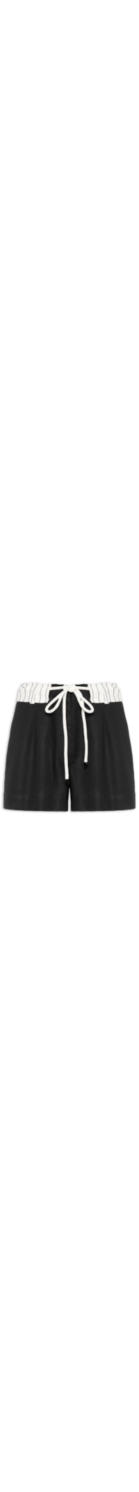 O short preto é confeccionado em tecido leve com toque de linho sem elasticidade. A peça solta ao corpo possui cintura alta, cós off white com listras em cor contrastante e passantes, pences posteriores, bolsos posteriores, bolsos frontais embutidos, fendas laterais, pregas frontais e fechamento frontal por colchetes e zíper.