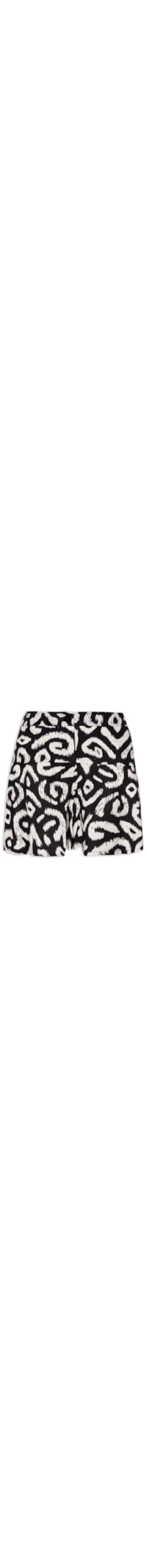 O short preto é confeccionado em tecido leve com toque de linho sem elasticidade. A peça solta ao corpo possui cintura alta, recorte frontal e posterior, estampa abstrata em tom contrastante, comprimento curto e fechamento frontal em zíper e botão.