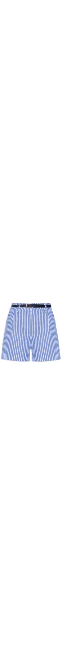 O short azul é confeccionado em tecido leve sem elasticidade. A peça solta ao corpo, possui cintura alta, cós com passantes aplicados e elástico embutido na parte posterior, pregas frontais, bolsos frontais de modelo faca, barra italiana, padronagem de listras em cor contrastante, forro e fechamento frontal por zíper e botão forrado. Acompanha cinto na cor preta em material sintético para uso opcional, possui espessura fina, passante fixo, perfuros para regulagem e fechamento frontal por fivela metálica.