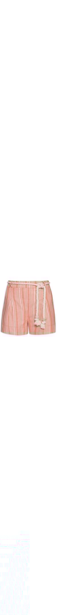O short rosa é confeccionado em tecido leve com toque de linho sem elasticidade. A peça solta ao corpo possui cintura alta, cós com passantes aplicados, bolsos frontais de modelo faca, pregas frontais, pences posteriores, barra estendida, padronagem listrada em cor contrastante, comprimento curto e fechamento lateral em zíper invisível. Acompanha cinto médio em cordão torcido de cor contrastante com ponteira em miçanga esférica e tassel para uso opcional.