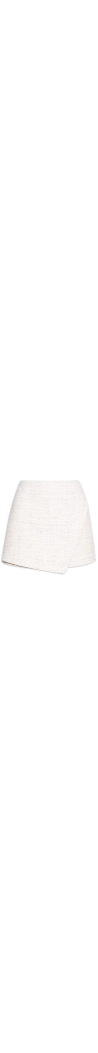 O short saia bege é confeccionado em tweed sem elasticidade. A peça solta ao corpo possui cintura alta, pences posteriores, recorte frontal assimétrico sobreposto, forro, comprimento curto e fechamento posterior em zíper.