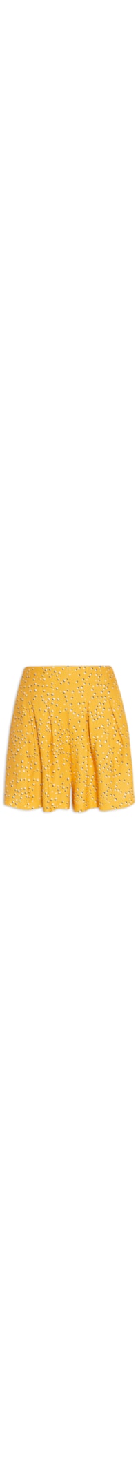 O short amarelo é confeccionado em tecido leve. A peça possui cintura alta, bolsos frontais, pregas frontais e pences posteriores, padronagem poá em cores contrastantes, shape solto e fechamento lateral por zíper invisível.