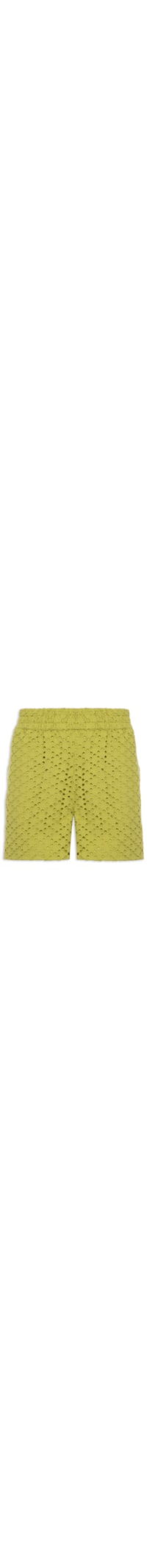 O short verde é confeccionado em laise. A peça possui cintura alta, cós elástico, bolsos frontais, forro, shape solto, comprimento curto, caimento reto e acabamento pespontado.