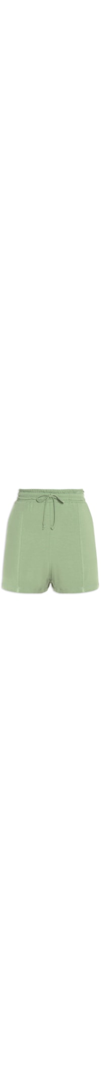 O short verde é confeccionado em malha. A peça possui cintura alta, cós com elástico embutido e recortes sobrepostos, cordão embutido para ajuste e amarração, bolsos frontais, comprimento curto, shape solto, caimento reto e acabamento pespontado.