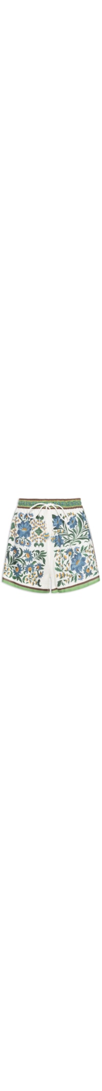 O short branco é confeccionado em tricoline com baixa elasticidade. A peça solta ao corpo possui cós amplo com elástico e cordão embutidos, cintura média bolsos frontais embutidos, mix de estampas florais em cores contrastantes e comprimento curto.
