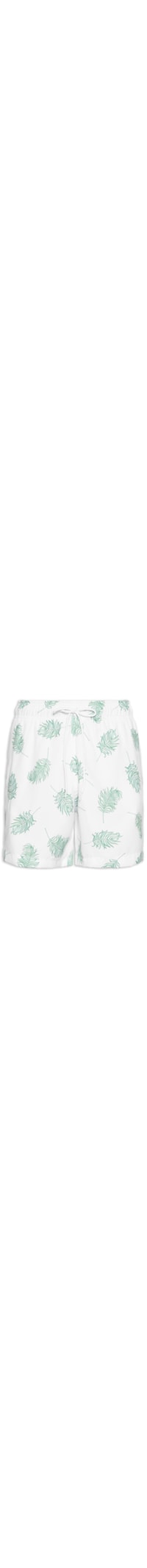 O short branco é confeccionado em tactel sem elasticidade. A peça solta ao corpo possui cós elástico com cordão embutido para ajuste frontal, cintura média, bolsos frontais embutidos, um bolso posterior e estampa figurativa de folhagem em cor contrastante.