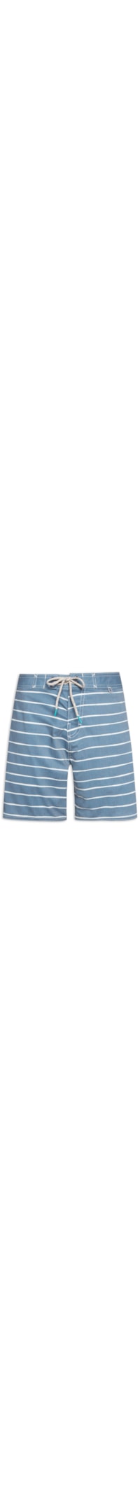 O short azul é confeccionado em tecido leve com baixa elasticidade. A peça solta ao corpo possui cintura média, cós com ilhoses aplicados na parte frontal e cordão em cores contrastantes com ponteira em cor contrastante transpassado para ajuste, elástico aplicado na parte frontal do cós, dois bolsos laterais, tag da marca aplicada em cor contrastante na parte frontal na área do quadril, bolso na parte posterior com ilhós em cor contrastante aplicado e aba sobreposta com tag da marca aplicada em cor contrastante e fechamento por velcro, padronagem listrada em cor contrastante, acabamento pespontado em cor contrastante, forro, e comprimento curto.