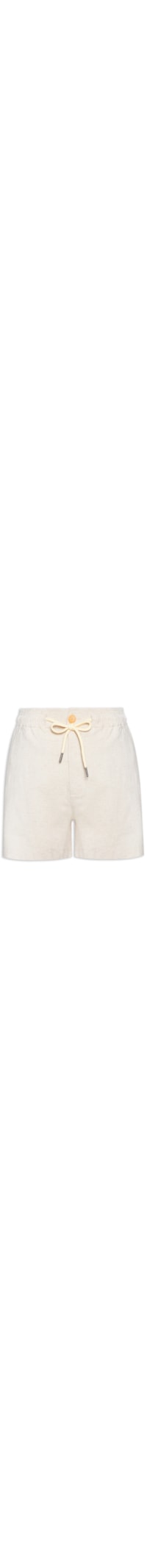 O short bege é confeccionado em tecido leve com toque de linho e baixa elasticidade. A peça solta ao corpo, possui cintura média, cós com elástico embutido e cordão para amarração frontal, bolsos faca frontais, bolso frontal embutido, bolso posterior com fechamento por botão, comprimento curto e fechamento frontal por zíper e botão.