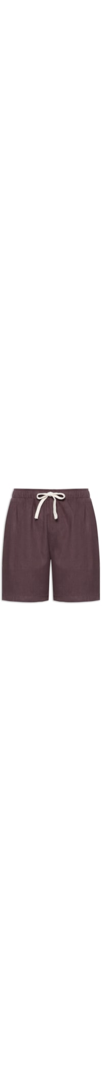 O short roxo é confeccionado em linho sem elasticidade. A peça solta ao corpo possui cintura média, cós elástico com cordão em cor contrastante embutido para ajuste, bolsos frontais modelo faca, bolsos posteriores com fechamento por botão, tag da marca em cor contrastante aplicada na parte posterior, pequenas fendas laterais e comprimento curto.