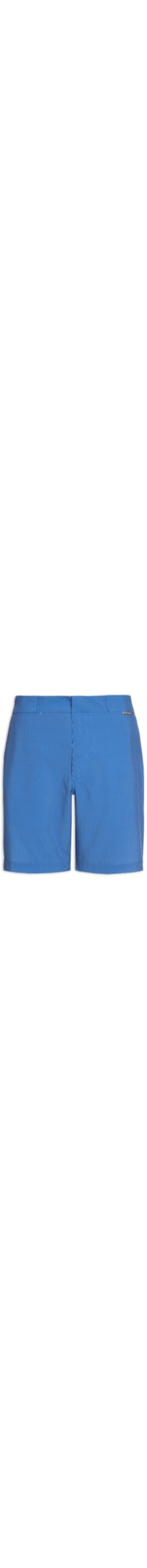 O short azul é confeccionado em tactel com baixa elasticidade. A peça solta ao corpo possui cintura média, cós com ajuste nas laterais, bolsos frontais modelo faca, tag da marca bordada na parte frontal, padronagem de listras em cor contrastante, bolso posterior embutido com fechamento em zíper e fechamento frontal por botões de pressão e zíper