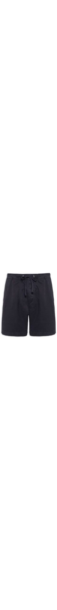 O short azul marinho é confeccionado em sarja sem elasticidade. A peça solta ao corpo possui cintura média, cós com elástico e tira alongada embutida para ajuste e amarração frontal, bolsos frontais de modelo faca, bolso posterior com fechamento em aba sobreposta e botão, fendas laterais e comprimento curto.