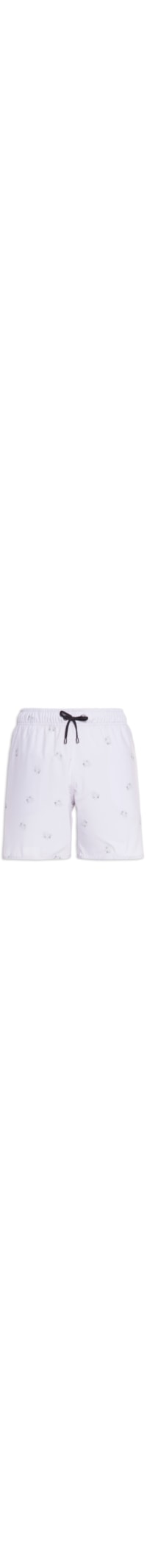 O short cinza é confeccionado em tactel. A peça possui cintura média, cós elástico com cordão embutido para ajuste, bolso posterior com aplicação de ilhós e fechamento por velcro, bolsos frontais embutidos, tag da marca aplicada na altura da barra, estampa figurativa, shape solto, caimento reto e acabamento pespontado.