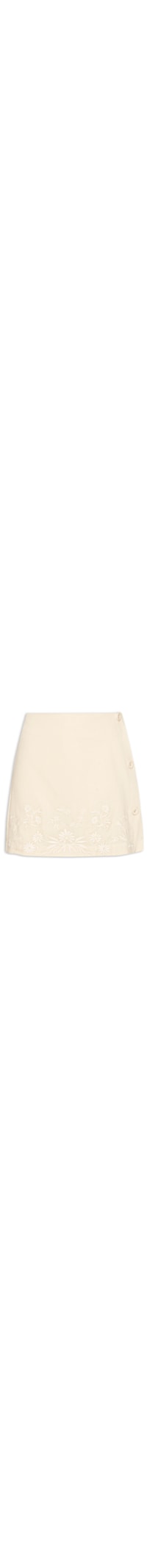 O short saia bege é confeccionado por tecido leve com toque em linho sem elasticidade. A peça solta ao corpo possui cintura média, bordados florais frontais e posteriores, botões decorativos aplicados nas laterais, fechamento lateral por zíper e comprimento curto.