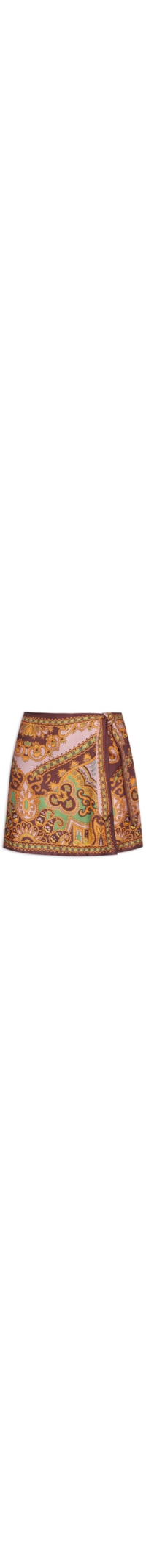 O short saia marrom é confeccionado em tecido leve sem elasticidade. A peça solta ao corpo possui cintura alta, recorte frontal sobreposto com tiras alongadas para amarração na lateral, pences posteriores, mix de estampas em cores contrastantes, comprimento curto e fechamento lateral por zíper invisível.