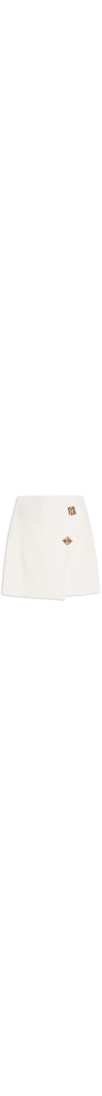 O short saia off white é confeccionado em tecido encorpado sem elasticidade. A peça possui cós aplicado, modelagem reta, sobreposição de saia frontal transpassada, aplicação de botões metálicos decorativos, comprimento curto e fechamento lateral por zíper invisível.