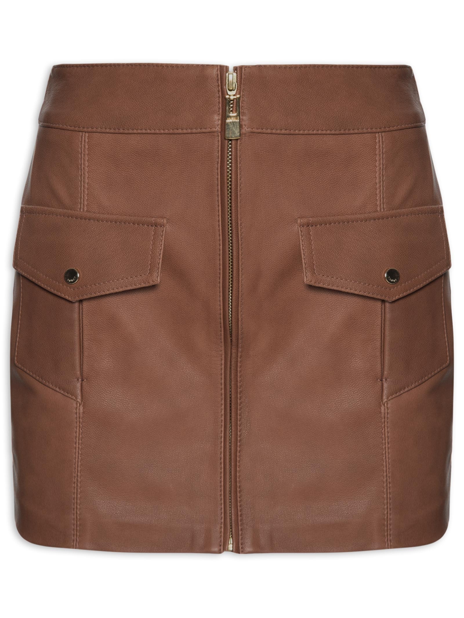 O short saia marrom é confeccionado em couro sem elasticidade. A peça solta ao corpo possui cintura alta, recortes frontais e posteriores com detalhe de pespontos, bolsos frontais com fechamento em aba sobreposta, forro, comprimento curto e fechamento frontal em zíper.