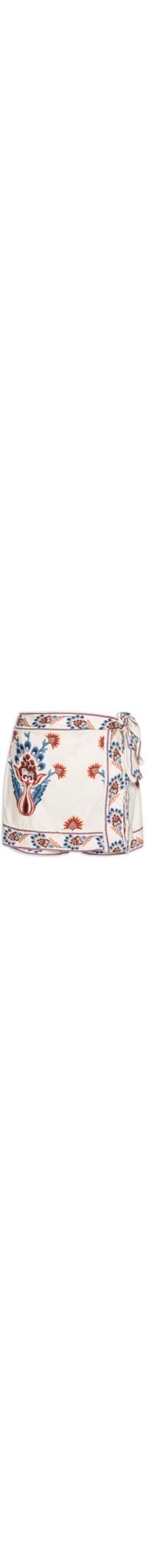 O short saia off white é confeccionado em tecido leve sem elasticidade. A peça solta ao corpo possui cintura alta, cós com elástico embutido na parte posterior, tecido sobreposto com tira alongada aplicada para amarração lateral e estampa floral em cores contrastantes.