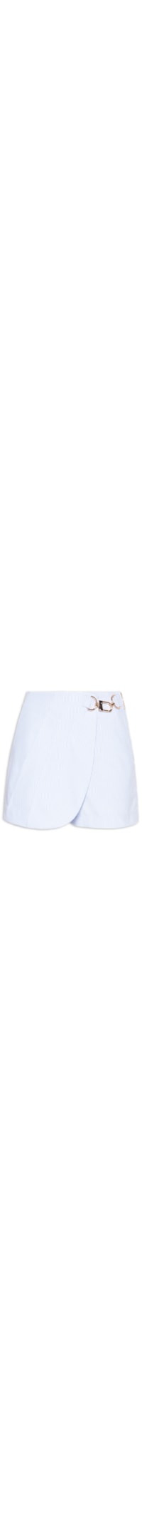 O short saia azul é confeccionado em tecido leve sem elasticidade. A peça solta ao corpo possui cintura alta, tecido transpassado na pate frontal, bolsos frontais modelo faca, pences posteriores, aplicação de mosquetão e elos metalizados, bolsos posteriores, pences frontais, comprimento curto e fechamento lateral por zíper.