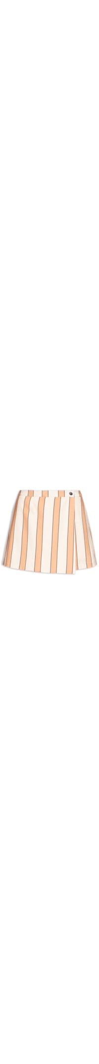O short saia bege é confeccionado em tecido leve sem elasticidade. A peça solta ao corpo possui cintura média dois bolsos frontais de modelo faca, dois bolsos decorativos posteriores embutidos, tecido sobreposto na parte frontal fechado por botão de pressão, comprimento curto e fechamento frontal por zíper e botão de pressão.