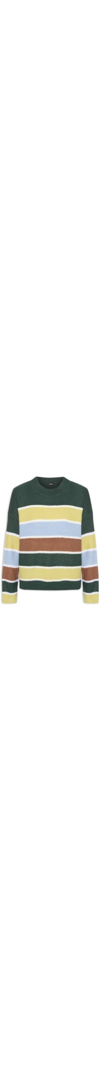 O suéter verde é confeccionado por tricot com média elasticidade. A peça solta ao corpo possui decote redondo, mangas longas, ombros entendidos, padronagem listrada em cores contrastantes e barra, punhos e gola com acabamento canelado.