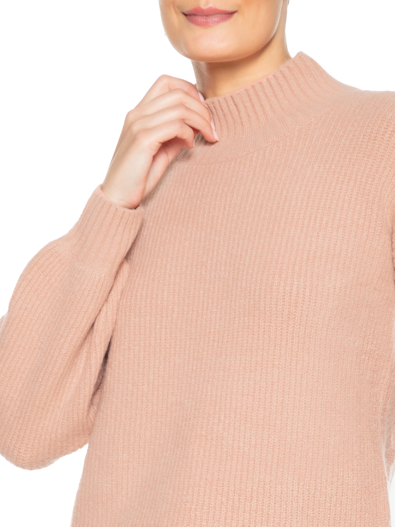 O suéter rosa é confeccionado em tricot com toque de lã e superfície texturizada. A peça solta ao corpo possui gola alta, ombros estendidos, mangas longas amplas e acabamento canelado.