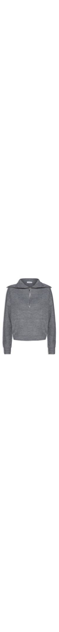 O suéter cinza é confeccionado em tricot com alta elasticidade. A peça solta ao corpo possui gola alta, mangas longas com acabamento canelado e fechamento por zíper frontal.