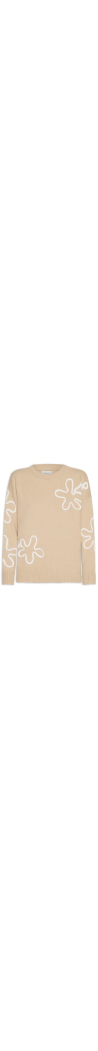 O suéter bege é confeccionado em tricot com alta elasticidade. A peça solta ao corpo possui decote redondo, mangas longas com ajuste nos punhos, ombros estendidos e aplicações de aviamento na cor branca com formato abstrato.