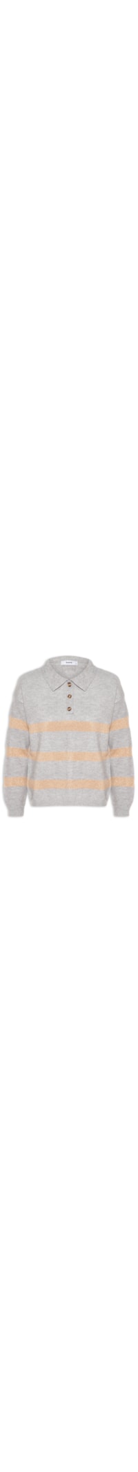O suéter cinza é confeccionado em tricot com baixa elasticidade. A peça solta ao corpo possui gola esporte com abertura frontal e botões, mangas longas com punhos canelado, padronagem de listras em cor contrastante e barra reta.