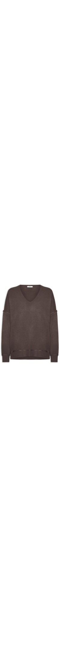 A blusa marrom é confeccionada em tricot com média elasticidade. A peça solta ao corpo possui decote V, mangas longas com ombros deslocados, caimento reto, acabamento canelado aplicado nos punhos e na barra e não possui fechamento.