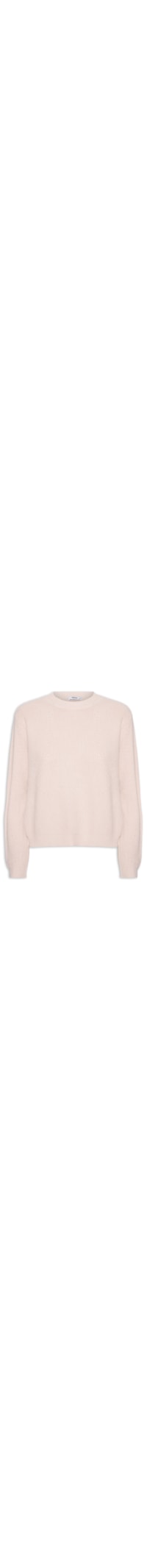 A blusa rosa é confeccionada em tricot com média elasticidade. A peça solta ao corpo possui gola redonda com acabamento canelado, mangas longas com punhos canelados, ombros levemente deslocados, caimento reto, textura canelada com pontos diferenciados, barra reta com acabamento canelado e sem fechamento.
