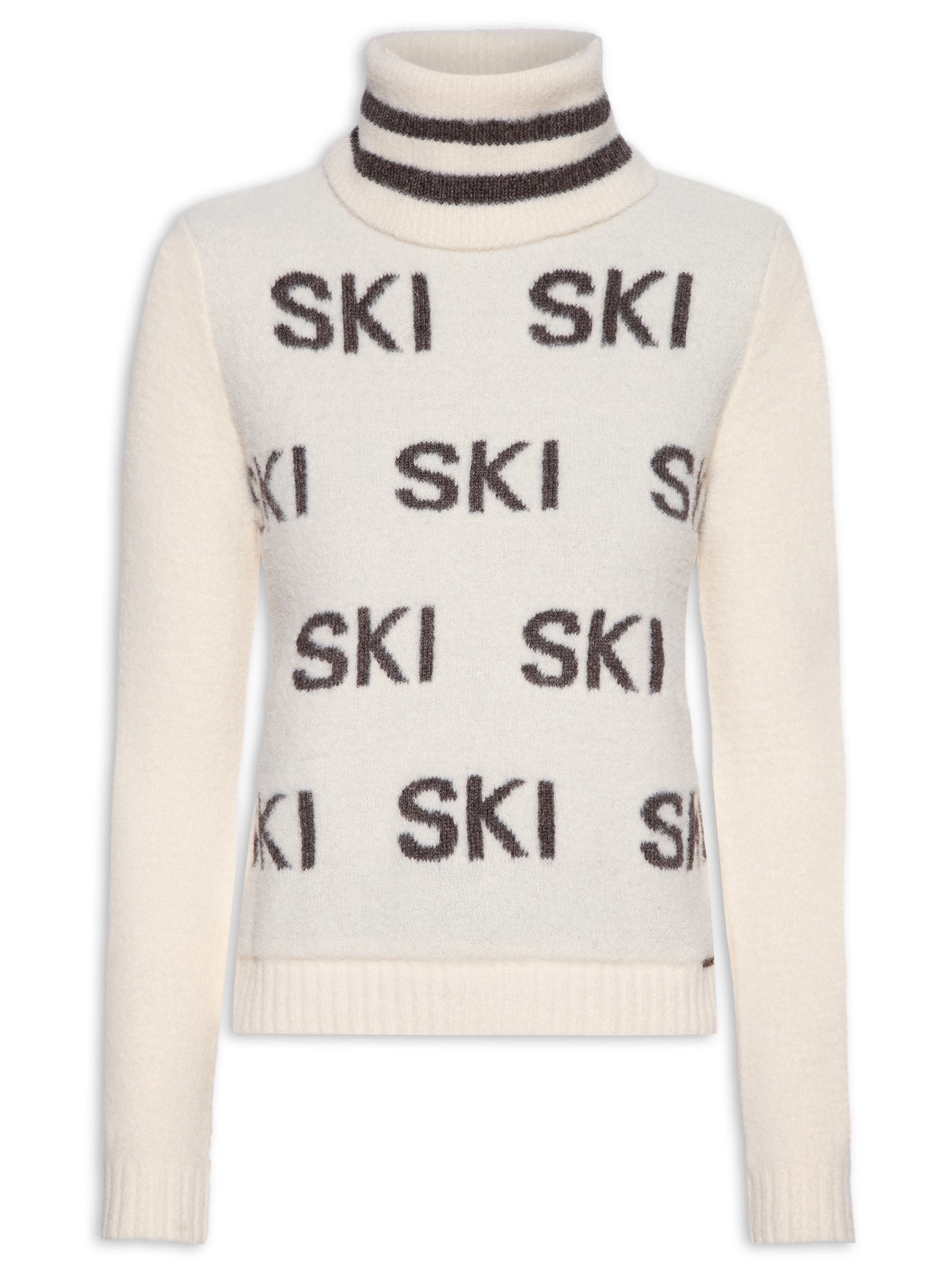 O suéter branco é confeccionado em jacquard de baixa elasticidade. A peça solta ao corpo possui gola alta removível com padronagem listrada em cor contrastante, mangas longas, padronagem escrita em cor contrastante e acabamento canelado.
