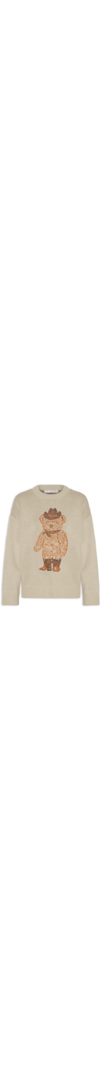 A suéter bege é confeccionada em tricot sem elasticidade. A peça solta ao corpo possui gola careca em acabamento canelado, mangas longas, estampa figurativa de urso em cores contrastantes, comprimento regular, barra e punhos canelados, sem forro e sem fechamento.