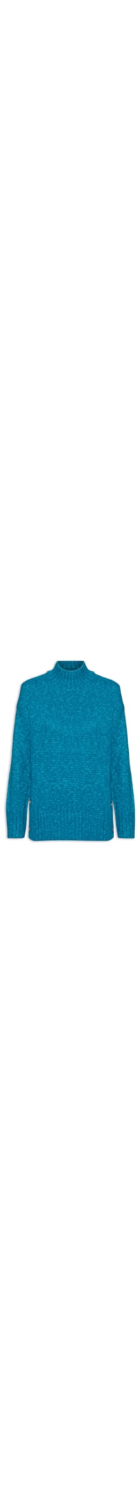 O suéter azul é confeccionado por tricot com média elasticidade. A peça solta ao corpo possui gola alta, mangas longas, ombros estendidos, fendas laterais com fechamento por botões e acabamento canelado nos punhos, gola e barra.