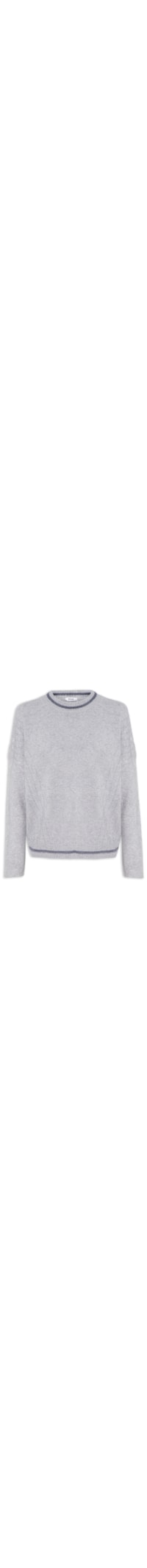 O suéter cinza é confeccionado em tricot com superfície texturizada e alta elasticidade. A peça solta ao corpo possui gola arredondada com frisos e textura, mangas longas, ombros estendidos e detalhe na trama.